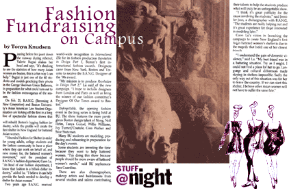 Interviewed local and international clothing designers and store owners; created fashion features targeted at students, club-goers and the Newbury Street shopping crowd.