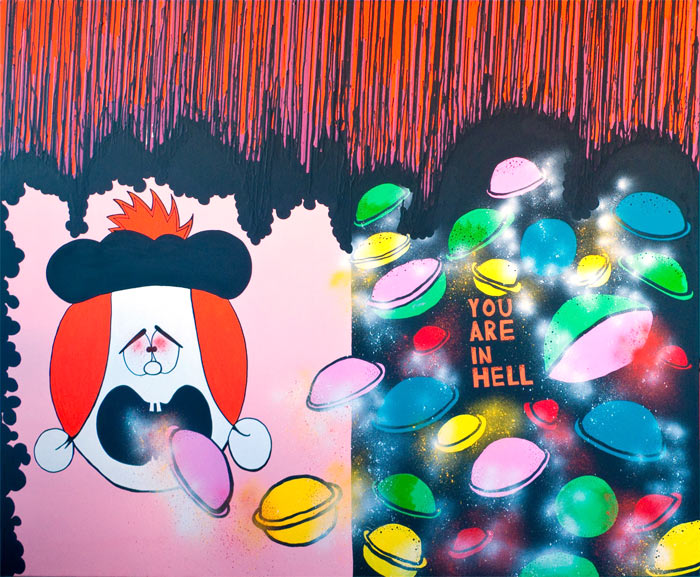 I admitted I am powerless over my addiction! My life is unmanageable due to flying saucers! 7FT by 5FT | ACRYLIC. SPRAY KRINK SHARPIE | 2011